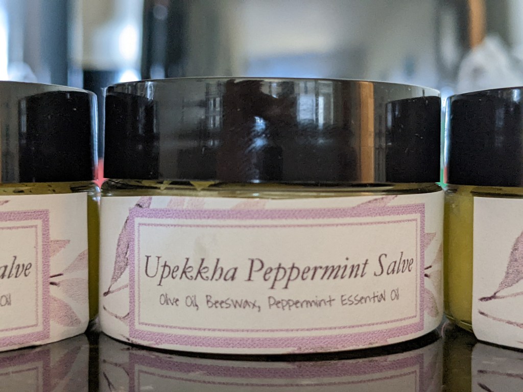 Peppermint Salve for your tension headache woes. Home-made in small batch with organic peppermint essential oil, olive oil and organic beeswax.